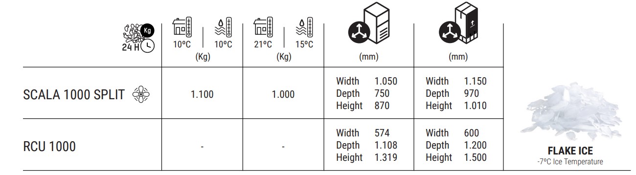 SCALA 1T + RCU1000 Esta máquina genera láminas de hielo planas, extremadamente frías y secas, con la capacidad de ajustar su grosor en un rango de 1.5 a 3 mm.