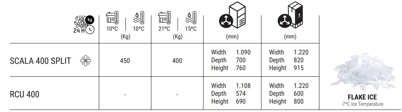 SCALA 400 REMOTE + RCU400 Produce escamas planas muy frías y secas. El espesor puede regularse entre 1.5 y 3 mm