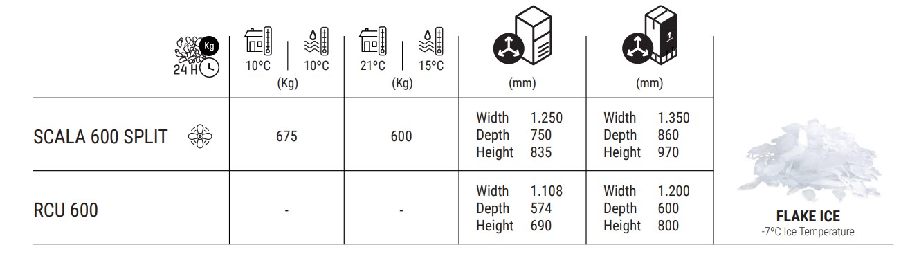 SCALA 600 + RCU600 Esta máquina produce láminas de hielo planas, extremadamente frías y secas, con la capacidad de ajustar el grosor en un rango de 1.5 a 3 mm.