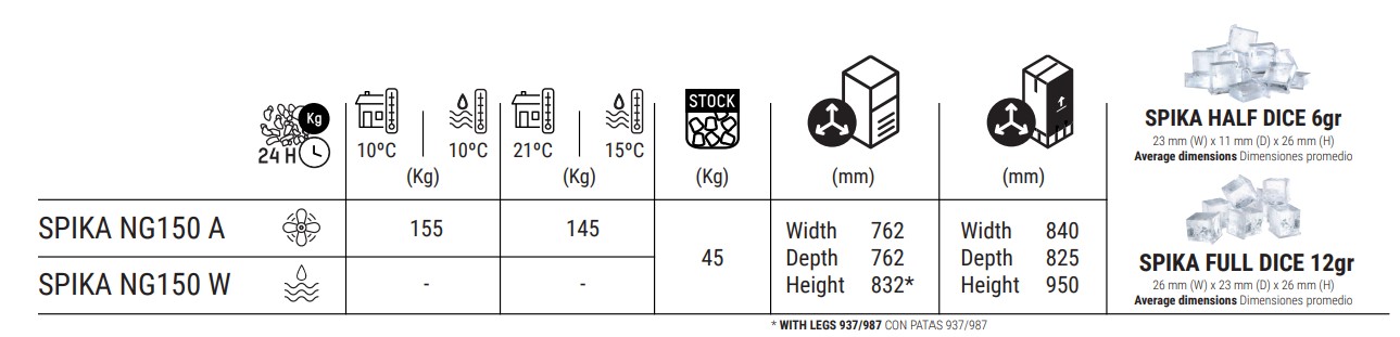 Las máquinas SPIKA cuentan con un evaporador vertical y utilizan el distribuidor de agua patentado por ITV para fabricar cubitos de hielo en forma de dados y medios dados.