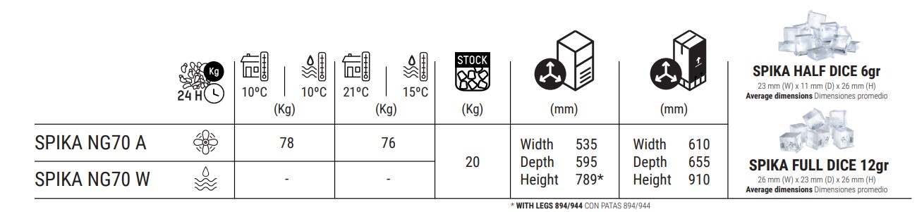Las máquinas SPIKA cuentan con evaporador vertical y utilizan el distribuidor de agua patentado por ITV para producir cubitos en forma de dados y medios dados.